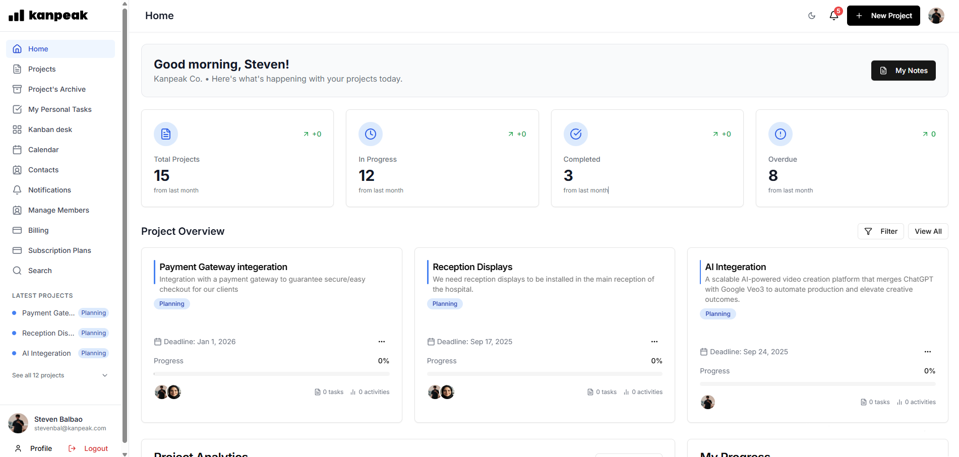 Kanpeak is your all-in-one project management solution designed to help teams create projects, assign tasks, track progress, and collaborate effortlessly. From Kanban boards to Gantt charts,